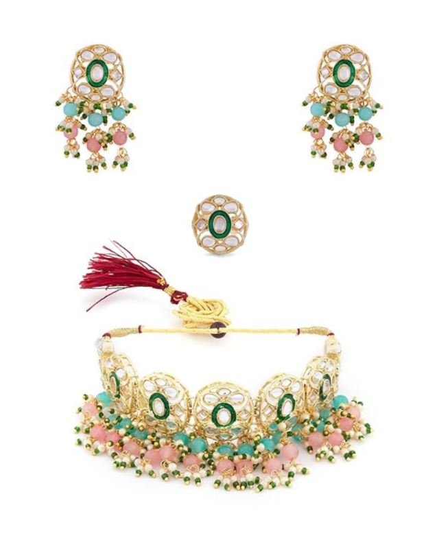 Pink & Green Beads with Kundan Choker Necklace, Earring and Ring Set